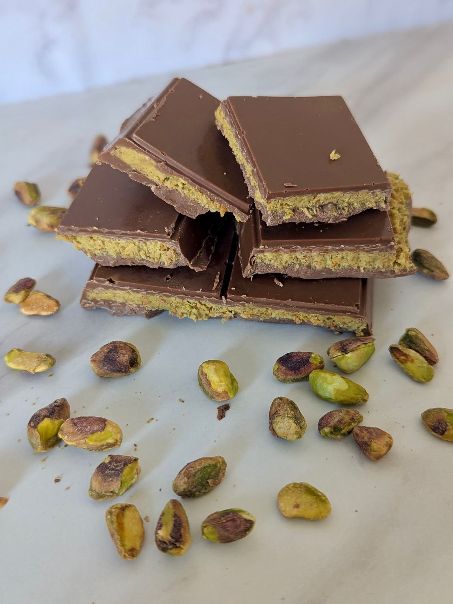 A unique fusion of traditional Middle Eastern Khunafa with a twist, this pistachio chocolate bar combines delicate layers of shredded pastry, pistachio nuts, and rich chocolate. A sweet, indulgent treat that’s homemade with care and no preservatives.